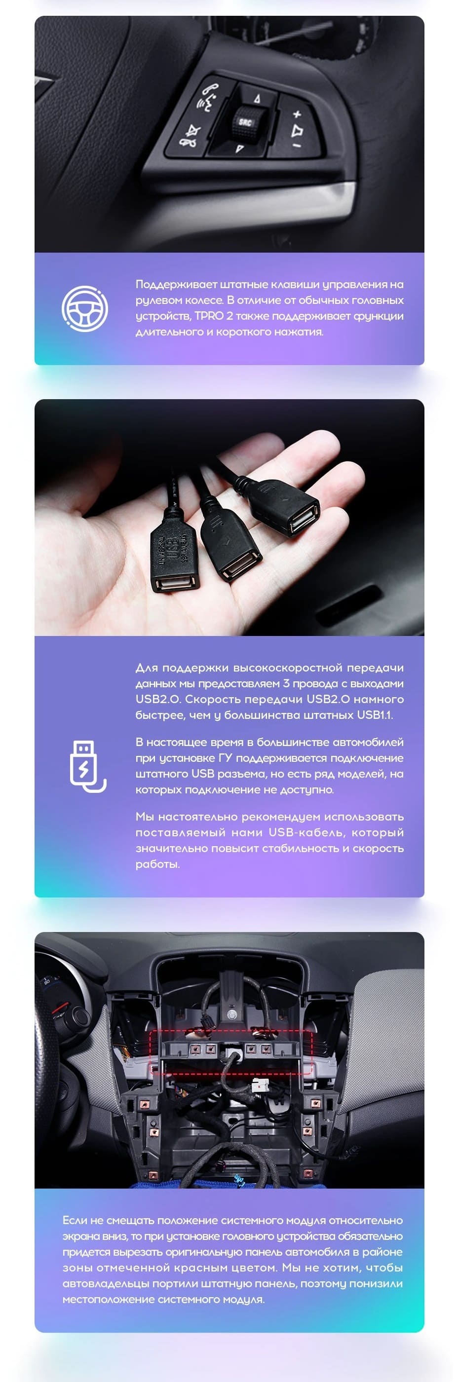 Вертикальная установка магнитолы закрывается специальной рамкой под определённый автомобиль. Утончённый, лаконичный дизайн Teyes TPRO 2 подойдёт под любую премиальную обшивку салона. Большой выбор цветовых решений интерфейса позволяет создавать индивидуальное оформление, чтобы мерцания и анимации на мониторе не отвлекали от езды. Teyes TPRO 2 - это симбиоз передовых технологий, созданный для вашего комфорта и безопасности.