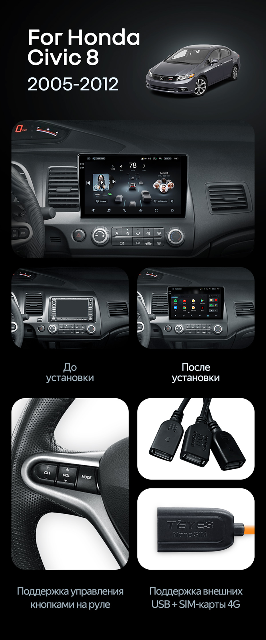 Штатная магнитола Teyes CC4 Pro 12/256 Honda Civic 8 FK FN FD (2005-2012) - купить всего за 66 100 руб. в интернет-магазине в Екатеринбурге Teyes.com.ru. ✓ Самый лучший выбор мультимедиа ✓ Лучшая замена штатному ГУ ✓ Тел. +7 (800) 775-31-74