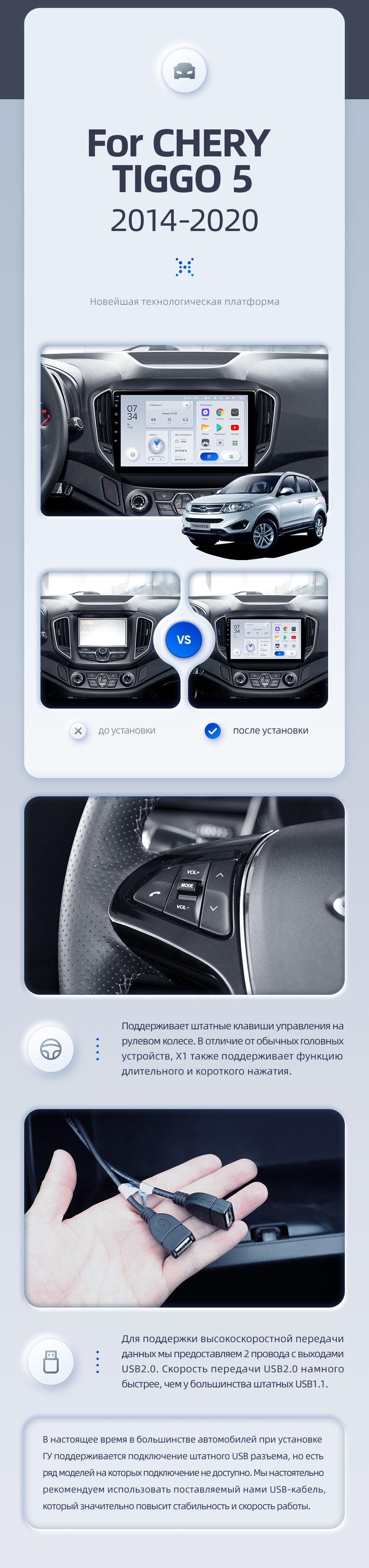 | USB | 3×USB 2.0 + USB 3.0 | Доп. аксессуары | Передняя/задняя AHD-камера, DVR-регистратор, TPMS, парковочный OBD, Type-C → HDMI |