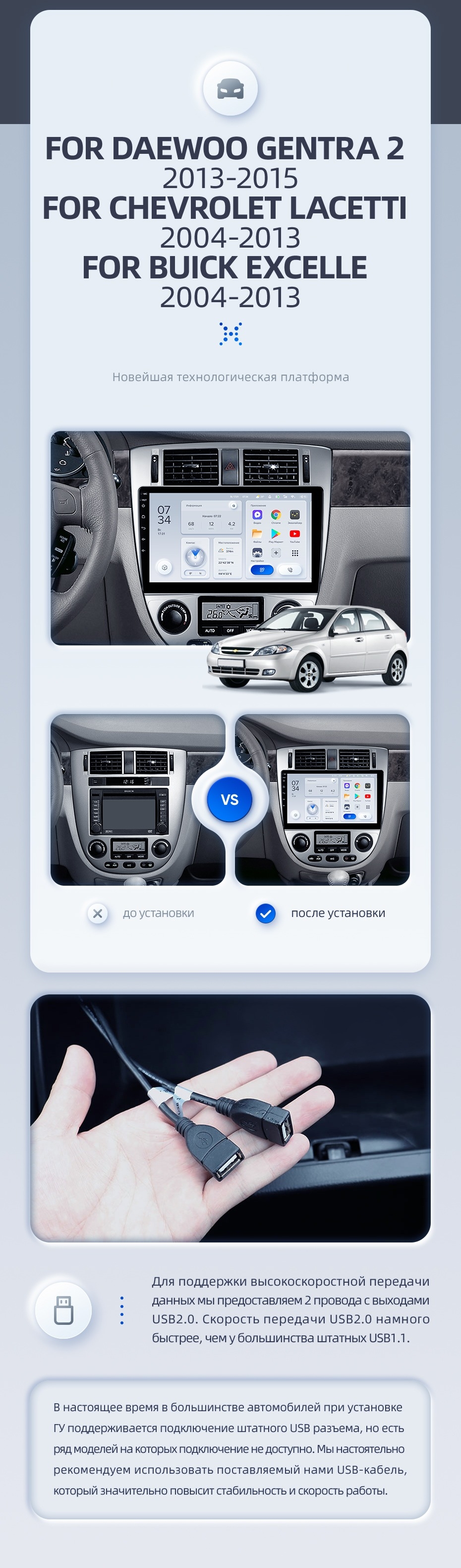 | USB | 3×USB 2.0 + USB 3.0 | Доп. аксессуары | Передняя/задняя AHD-камера, DVR-регистратор, TPMS, парковочный OBD, Type-C → HDMI |