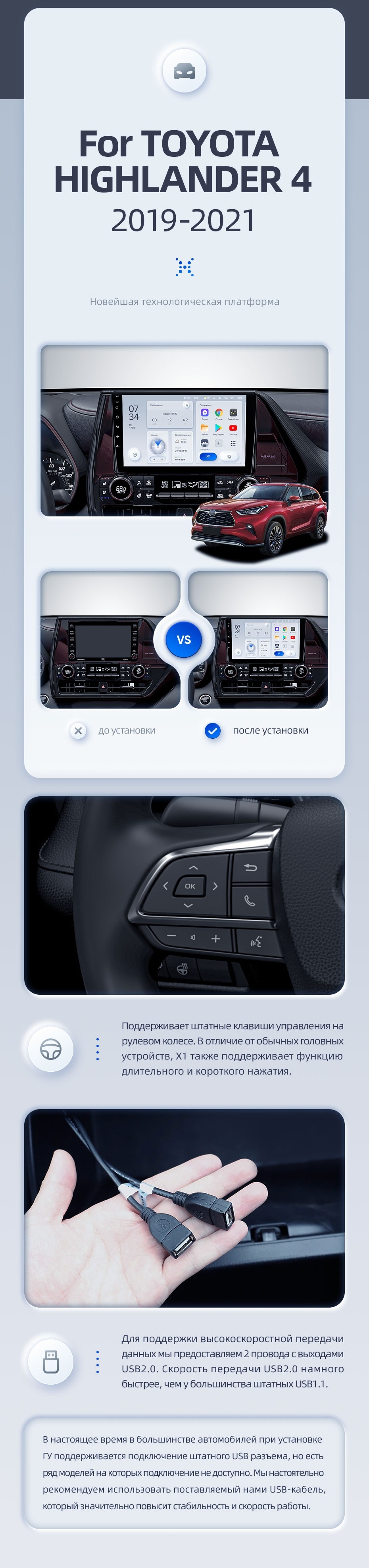 | USB | 3×USB 2.0 + USB 3.0 | Доп. аксессуары | Передняя/задняя AHD-камера, DVR-регистратор, TPMS, парковочный OBD, Type-C → HDMI |