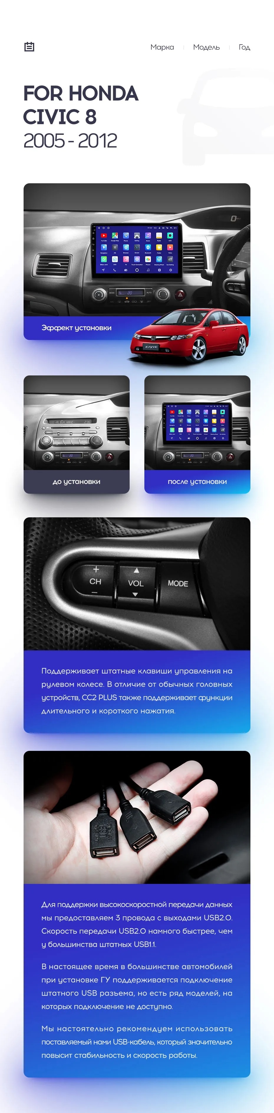 Полный комплект установки магнитолы Teyes с рамкой и проводкой можно выбрать в каталоге штатных магнитол Honda Civic 8 FK FN FD (2005-2012).