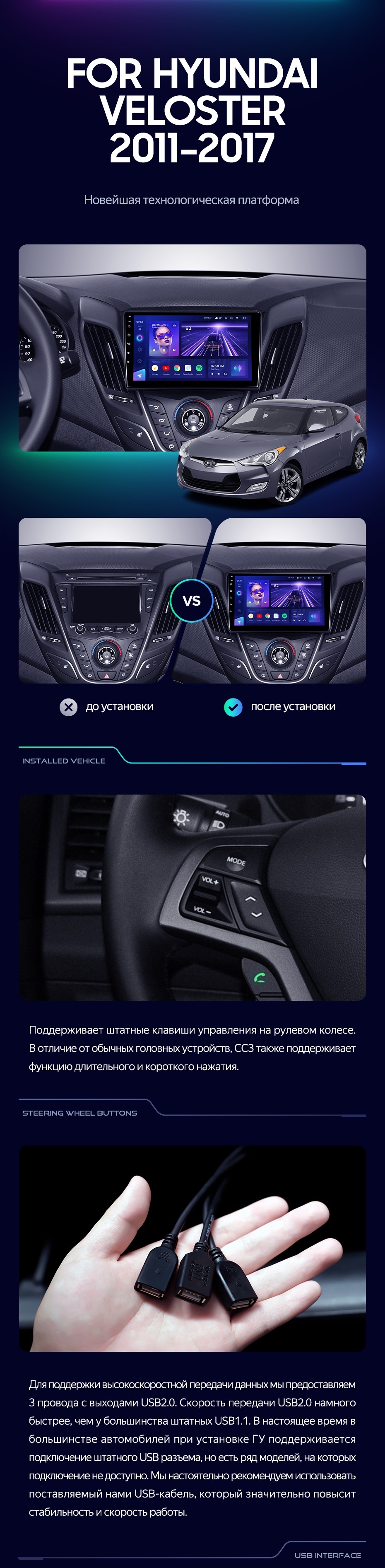 Полный комплект установки магнитолы Teyes с рамкой и проводкой можно выбрать в каталоге штатных магнитол Hyundai Veloster FS (2011-2017).