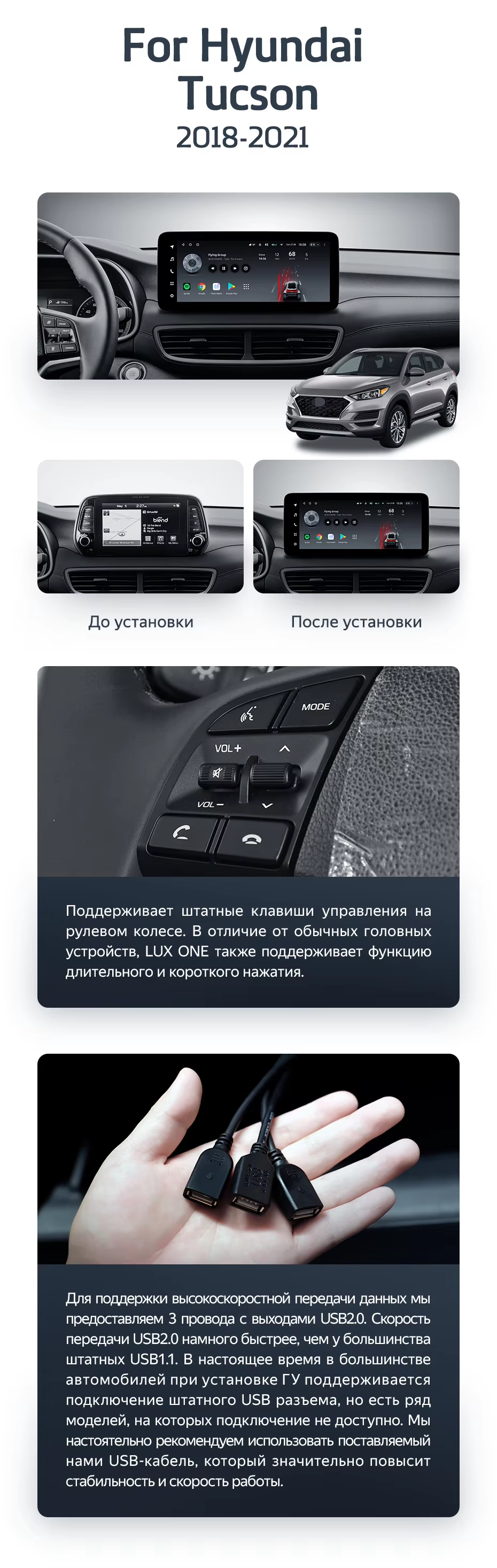 Установочный комплект для Hyundai Tucson (2018-2021) включает переходную рамку и проводку.