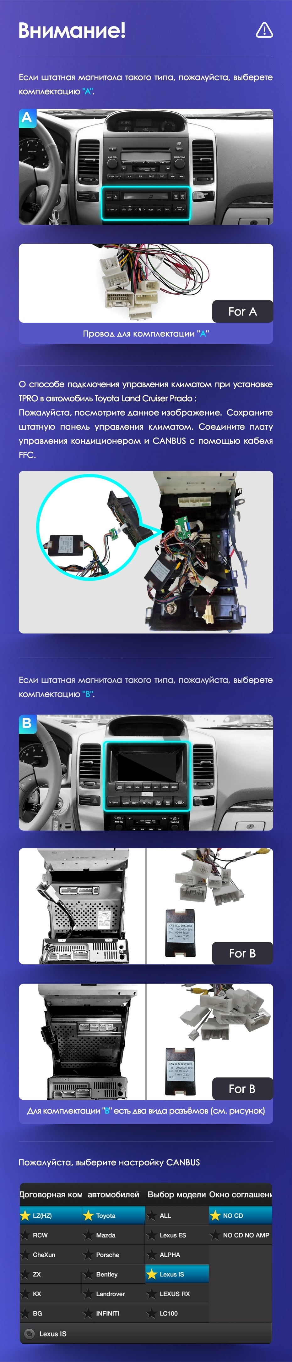 Полный комплект установки магнитолы Teyes с рамкой и проводкой можно выбрать в каталоге штатных магнитол Toyota Land Cruiser Prado 120 (2002-2009).